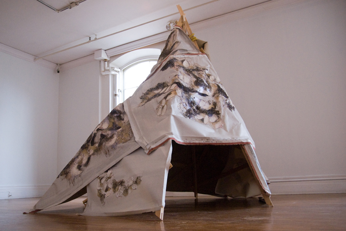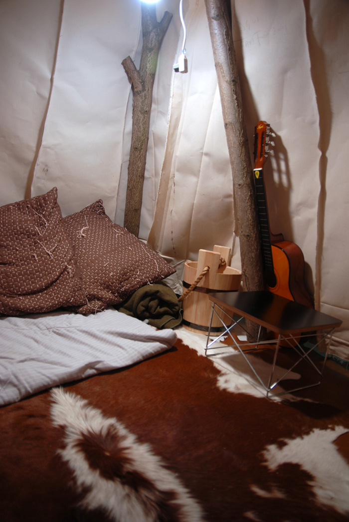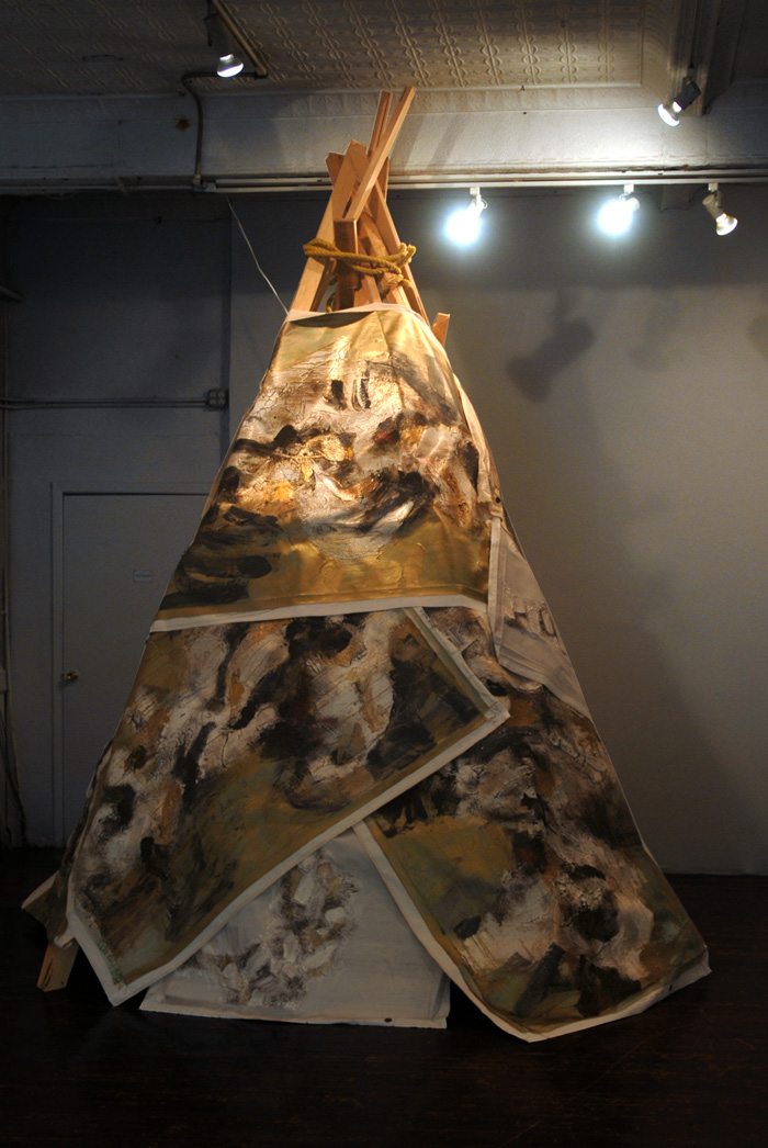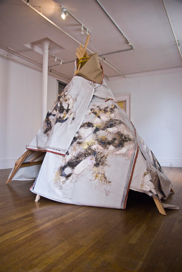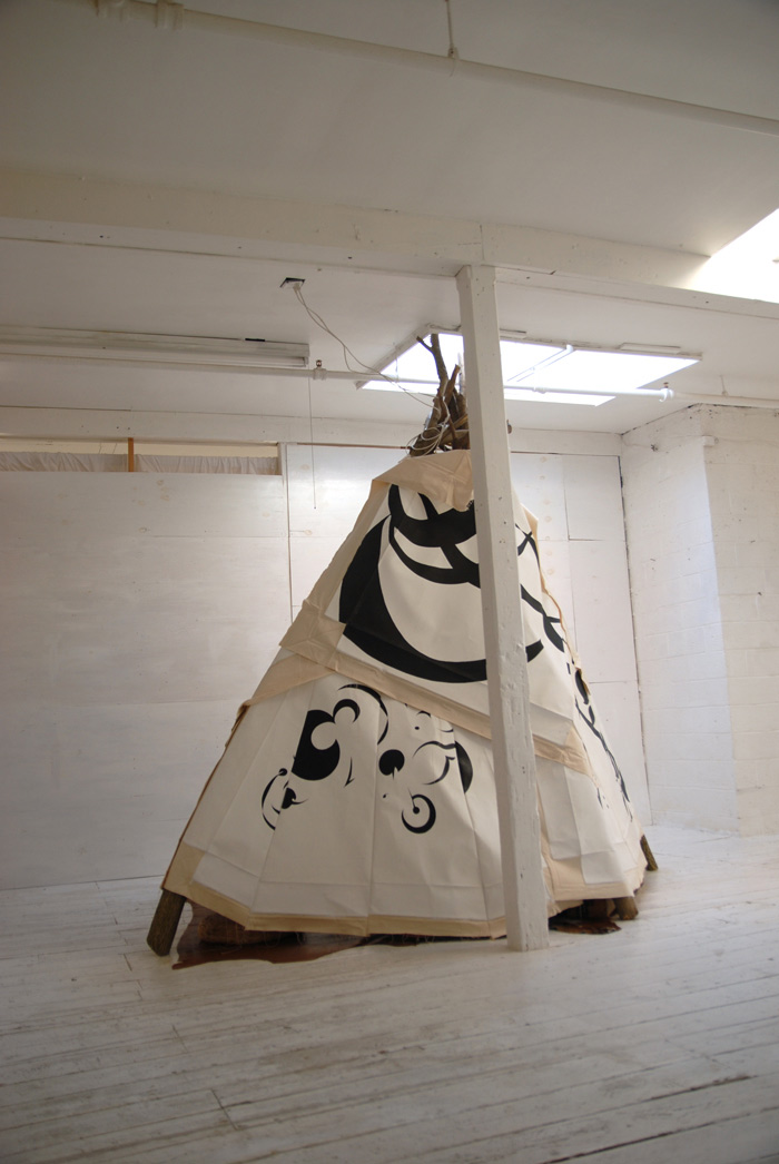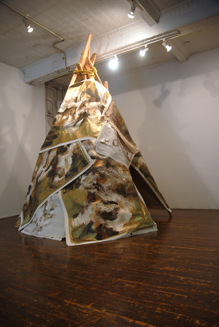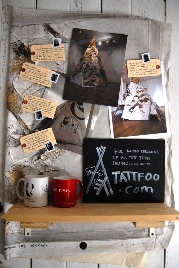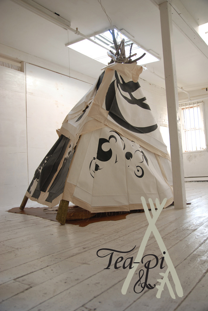 I had a teepee builded in my studio and re-used my paintings as the skin. Inside the structure is very cosy. It is lined with cowhide and pillows. I invited special guests (friends, neighbors, curators and artists) to come by and hang out, play some songs and have some creative conversation. Guests will be served High Tea accompany by fresh baked biscuits, short bread with assortments of teas to choose from. This session will be recorded and be broadcast as podcast and are available to the public. Tea-pi is an incubator for creative thinking and dialog or just having simple fun in an unusual architectural structure.