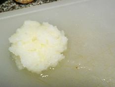 Then the frozen Kaeshi soup base in a bowl is ready to come out and ready to be enjoyed. The cooled soba noodles are served on a plate arranged nicely into a roll of noodles about the size of half a fist if preferred. Rolls of noodles look so cute in the middle of the plate looking calm and gray—literally. It is made of 30% buckwheat; which is very healthy for the physical body and mind possibly in my opinion. Next to it sits the dish of frozen soup base and the radish I grated and my arm almost fall off. A delicious dish overcomes all the processes and the thoughts that go through our minds. We mix a good small amount of grated white radish and scallions into the soup base. Then, we take little bits of noodles and dunk it in the sweet soup base and slurp it up. Sometimes, because the soup base is so cold, when the noodle is dunked into the soup base, the noodles freeze into funny structure shape but we just eat it anyway.