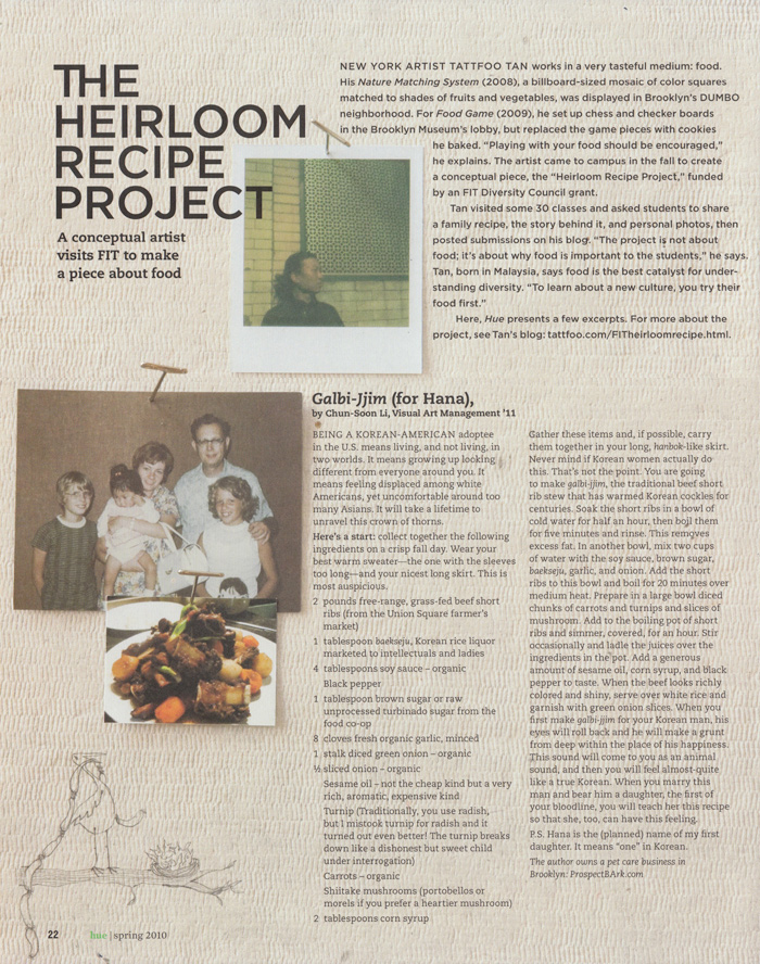 Tattfoo Tan as a Visiting Artist this semester at FIT. Sponsored by a grant from the Diversity Council, Tattfoo’s visit will focus on gathering and presenting recipes from members of the college community, based on their own cultural heritage. In 2008 Tattfoo created a similar project with Staten Island residents, Nuevo Americana Recipes. This compilation of stories, recipes, and photo essays expressed the immigrant experience through cuisine. For a sampling go to: http://tattfoo.com/recipe We are looking for students, clubs, and faculty members to collaborate with Tattfoo in areas such as: campus displays, art and design projects (all departments), photography, display design, event planning, writing and editing, and broadcasting. All members of the FIT faculty, students, staff, and clubs are invited to participate. Activities planned for Tattfoo’s visit are listed below, and suggestions for others are welcome.