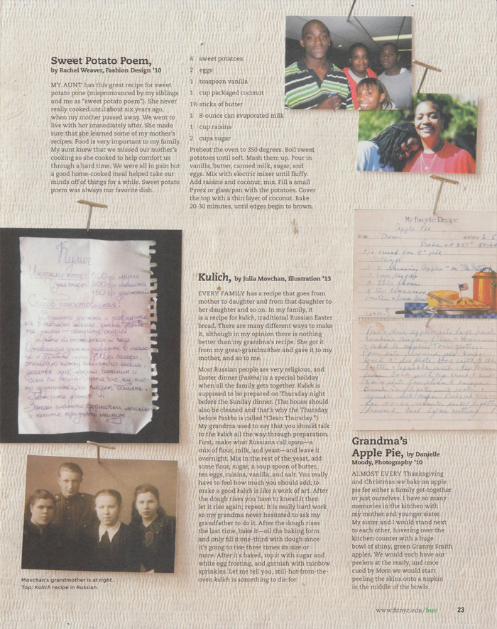 story about this special food and their memories of it. Recipes will be solicited from across the college and compiled on a blog that will include