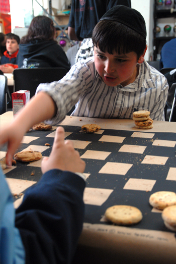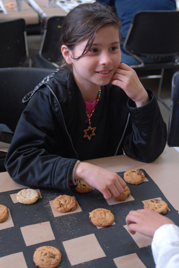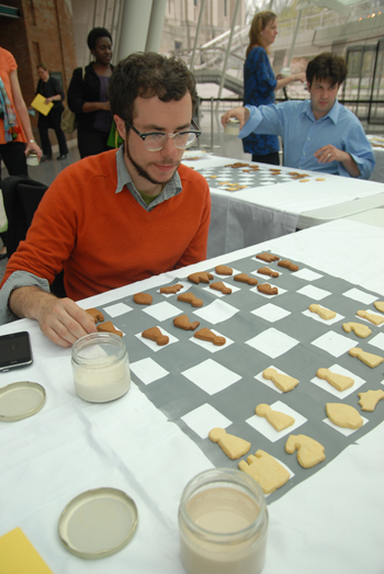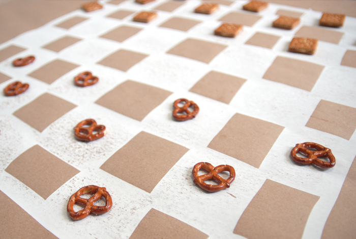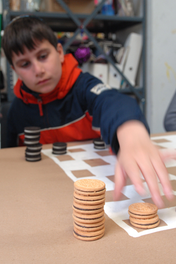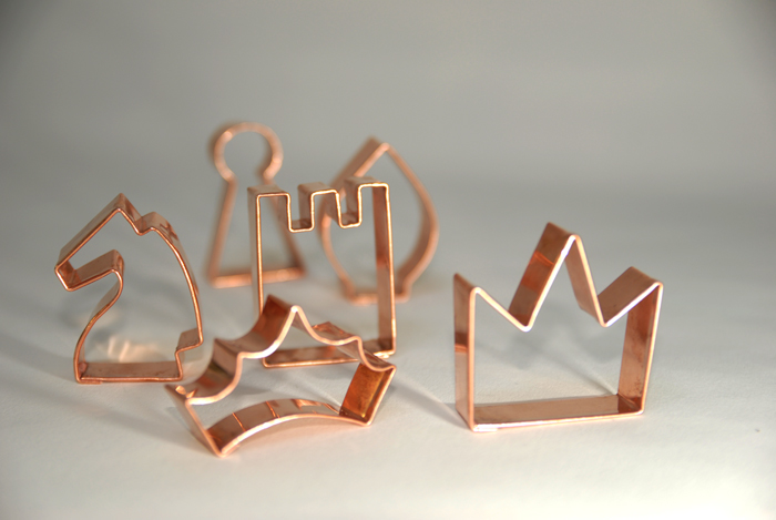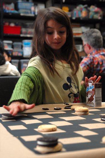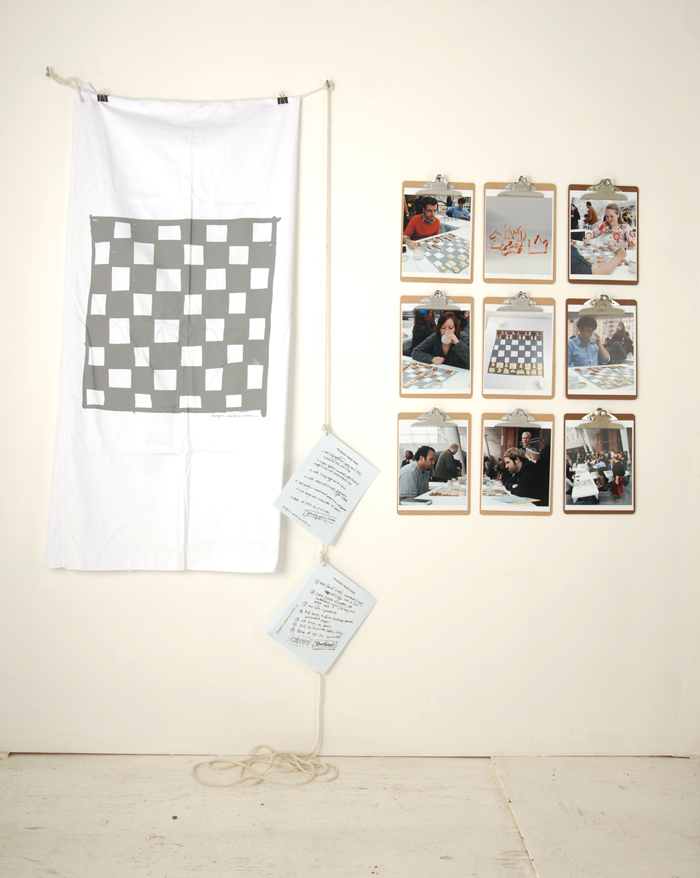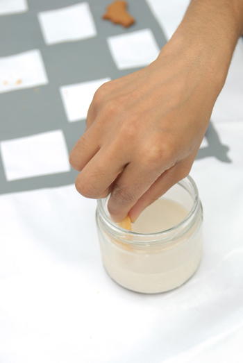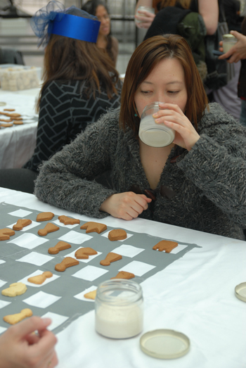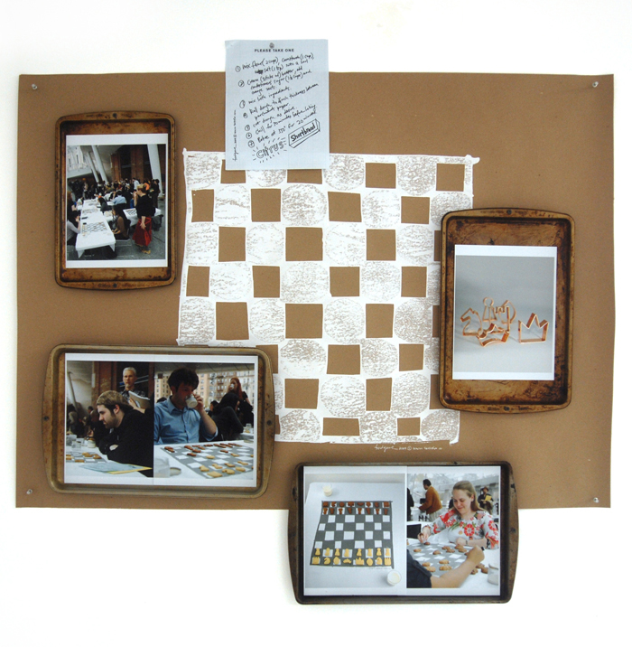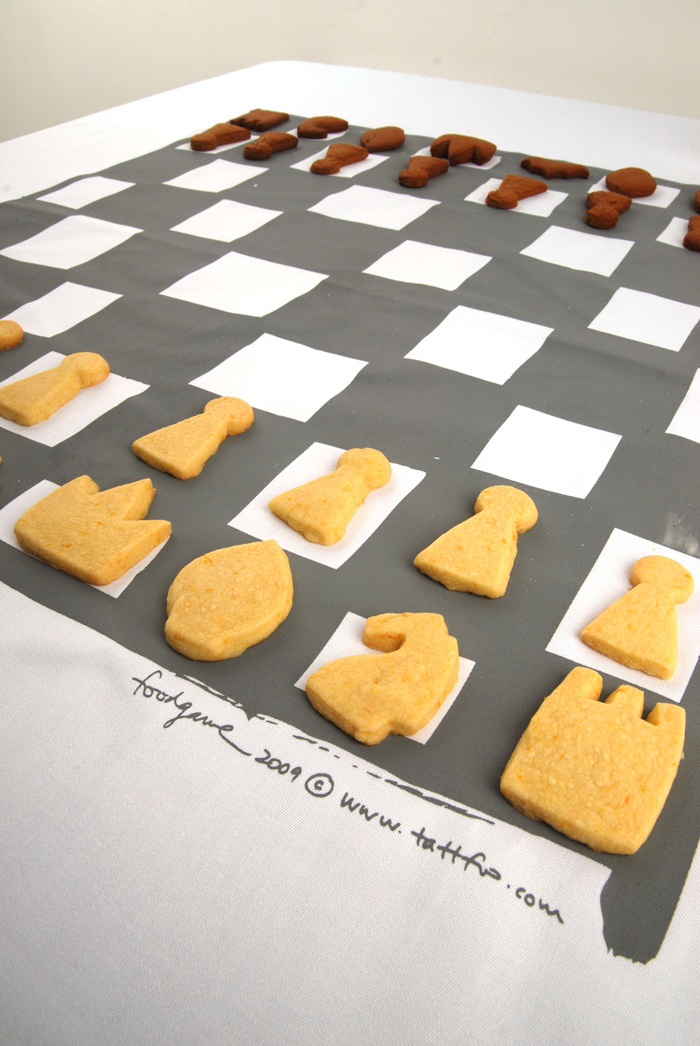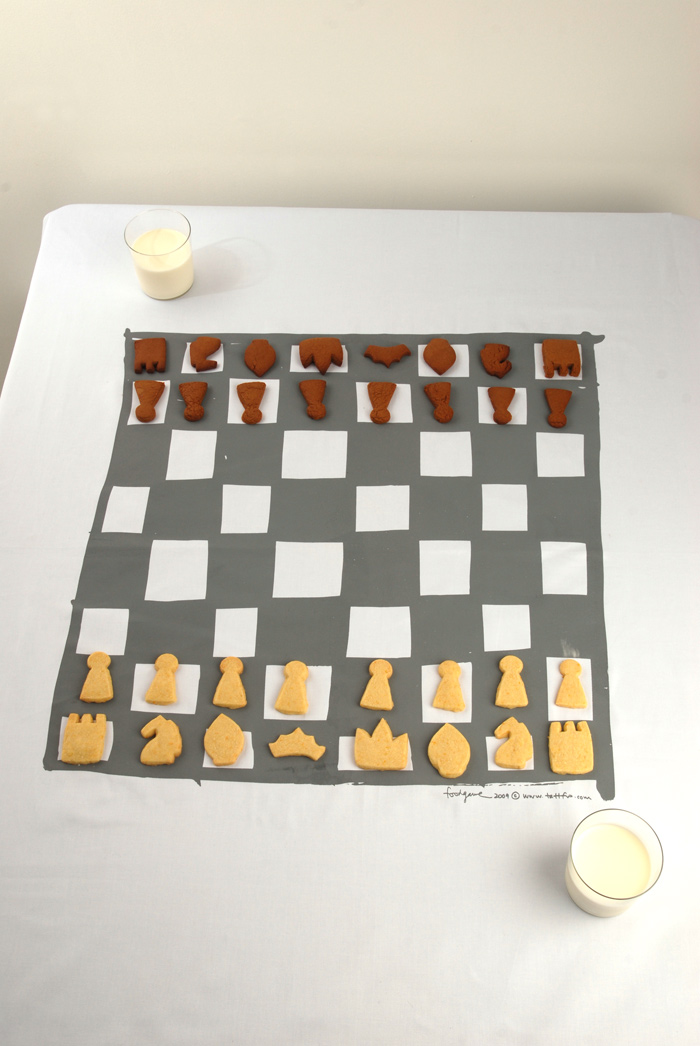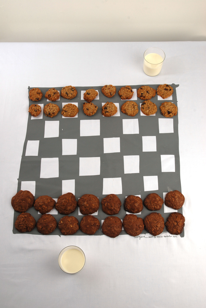 I’m exploring the ideas of food and play. Playing with your food should be encouraged. Here, I replaced the plastic checkers pieces with cream filled ginger cookies and chocolate cookies, and used custom-made cookie cutters to produce an edible chess set. When a player takes the opponent’s piece, or cookie in this case, it can be eaten. There is an accompanying glass of milk on the side. The checkerboard pattern is silkscreened on the table cloth.