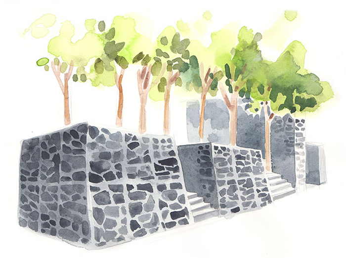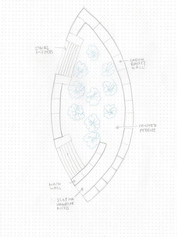 The pattern on this fence is based on the pattern of The Fruit of Life. This fence acts as the frame of a painting; it visually highlights and marks the area as an artwork. It also deters cars, postal trucks, garbage trucks, and other vehicles from reappropriating the land as parking spot. |