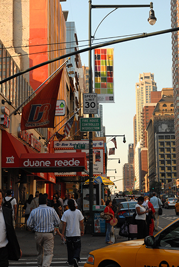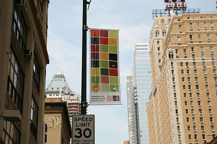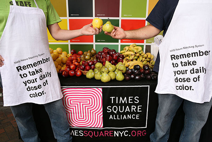 Nature Matching System mural at Port Authority Bus Terminal, New York, New York Transformation of 8th Ave Continues with one of the Largest Public Art Projects in Bus Terminal’s History. July 17, 2008 The giant grid of color, inspired by fresh fruits and vegetables, is one of largest public art projects ever at the Port Authority Bus Terminal, which is located in the Fashion District. Through the “NMS - Nature Matching System”, the thousands of daily visitors can visually learn the colors that contribute to a healthy lifestyle. The vinyl mural is 13 ft high and 180 ft wide and will run in the street-level windows on 8th Avenue between 41st and 42nd Streets and along 42nd Street. “Community projects like this are a welcome addition to the Port Authority Bus Terminal and another example of our continued commitment to our neighbors,” said Steve Napolitano, Bus Terminal Manager for the Port Authority of New York and New Jersey. “This impressive work of art will help to further integrate the Port Authority Bus Terminal into the boldly-colored and brightly-lit environment of New York City.” The “Nature Matching System” project on the bus terminal boldly reminds New Yorkers “to take your daily dose of color.” Tattfoo Tan precisely matched the healthy colors of 88 fresh fruits and vegetables through Photoshop software into a Pantone or paint chip display system. He wrote: “The shades of color displayed at farmers’ markets are more than skin deep, reflecting the inner potential of every fruit and vegetable; intense colors might even be called nature’s nutrition labels.” “This latest public art project is another example of the continued Renaissance of the 8th Avenue corridor,” said Barbara Randall, Executive Director of the Fashion Center BID. “The addition of a work by such a respected artist, further serves to enhance the pedestrian experience and the cultural value of the Fashion Center and Times Square areas.” “8th Avenue is already emerging as an Avenue of Architecture, and thanks to projects like this one at the Port Authority Bus Terminal, it’s also starting to stake a claim as an Avenue of Art,” said Times Square Alliance President Tim Tompkins. “This is a great example of the ways in which the creative energy of both Times Square and the Fashion District is making its mark on Eighth Avenue.”