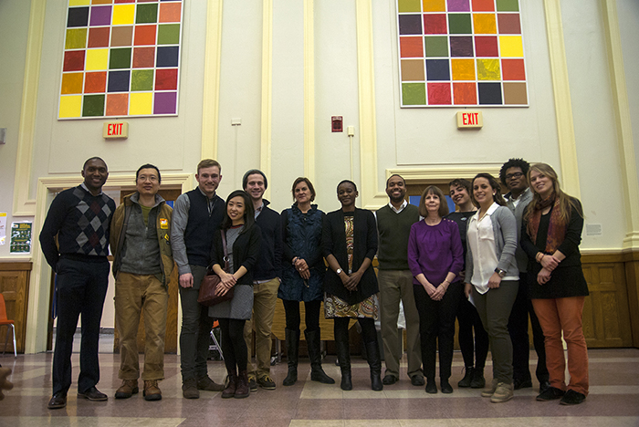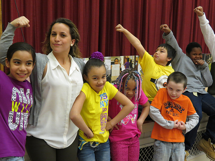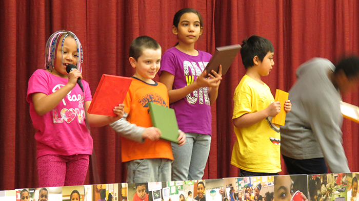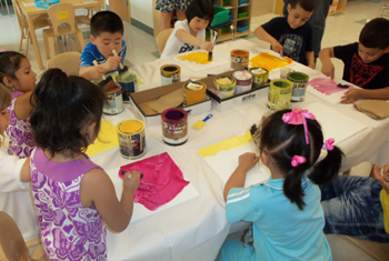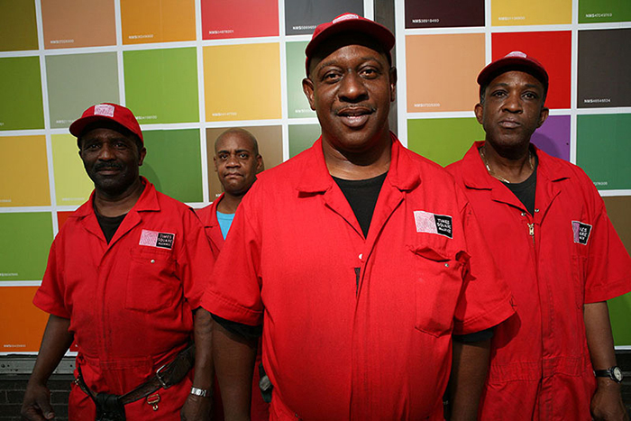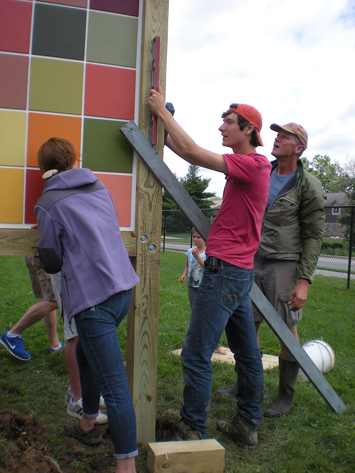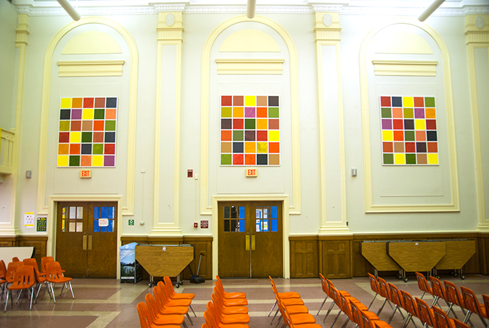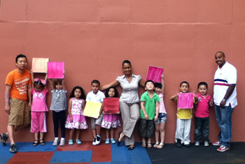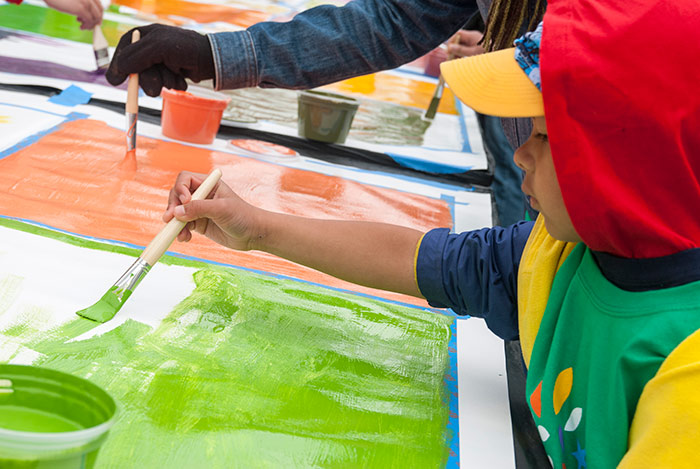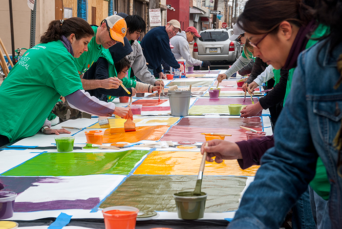 Students of P.S. 307 / Dr. Daniel Hale Williams Elementary School and young residents of DUMBO are helping to paint a color square.