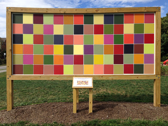 Nature Matching System in Philadelphia, Pennsylvania Nature Matching System, 2015, 47’ w x 21’h, acrylic paint on pellon, 641 Snyder Avenue at South 7 Street, Philadelphia. The tagline "Remember To Take Your Daily Dose of Colors" are translated into Karen, Nepali and Chin languages to reflects the diversity of the neighborhood.