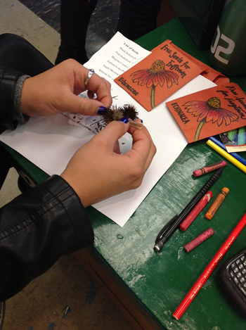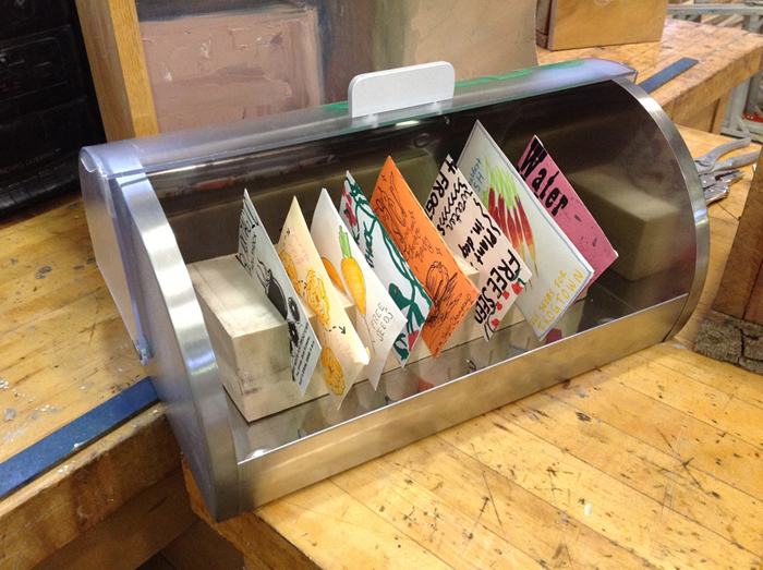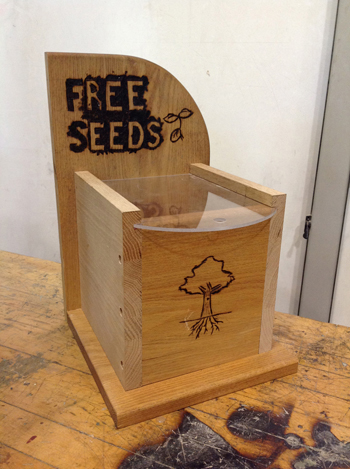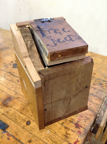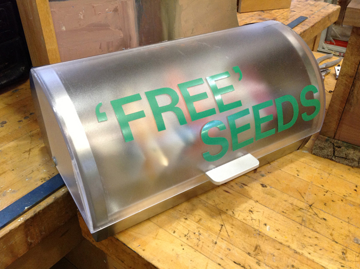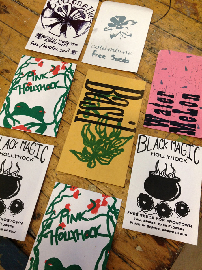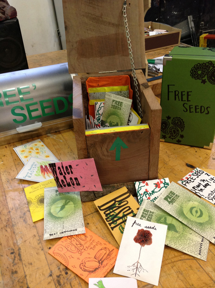 October 10, 2012 Macalester art students and guest artist Tattfoo Tan have launched a #FreeSeedLibrary initiative. Modeled on the Little Free Library system, students are making boxes for seeds to be put in public locations and traded freely. Students from Printmaking, Sculpture and Drawing classes designed, drew on and printed seed packets, and are building suitable containers with signage detailing the project. We are looking for community hosts for the seed libraries. Stop by the Art Building Sculpture Studio to see the progress of the project or sign up to host an artistic public seed give away system. Facebook page and Tumblr