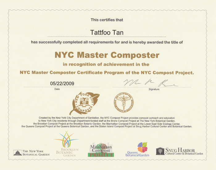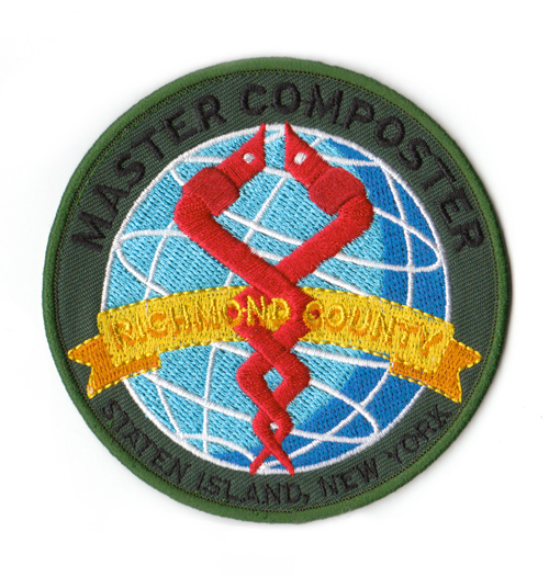Master Composter The Master Composter Certificate Course aims to train an enthusiast to be a compost expert and spread the compost know-how and making a meaningful impact in the community! This train-the-trainer course is designed to promote the practice of home composting and the reduction of our city’s solid waste. This course consist of 21 hours of classroom training (including two field trips), and 30 hours of volunteer outreach service in compost education and promotion. The course is free. Staten Island Compost Project, funded by the NYC Department of Sanitation Bureau of Waste Prevention, Reuse and Recycling, provides education and outreach for anyone interested in composting, an esssential horticultural and waste management practice that benefits our community and the environment. Patch design rational: I redesign the "Caduceus" symbol of divine providence and the embryo of life from a serpent to a red worm and place the icon of the earth at the background to show that composting save the earth.