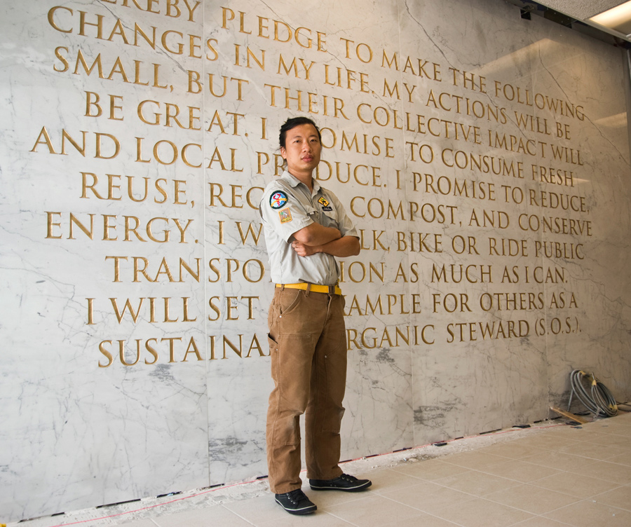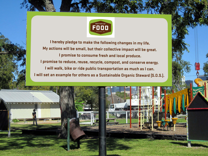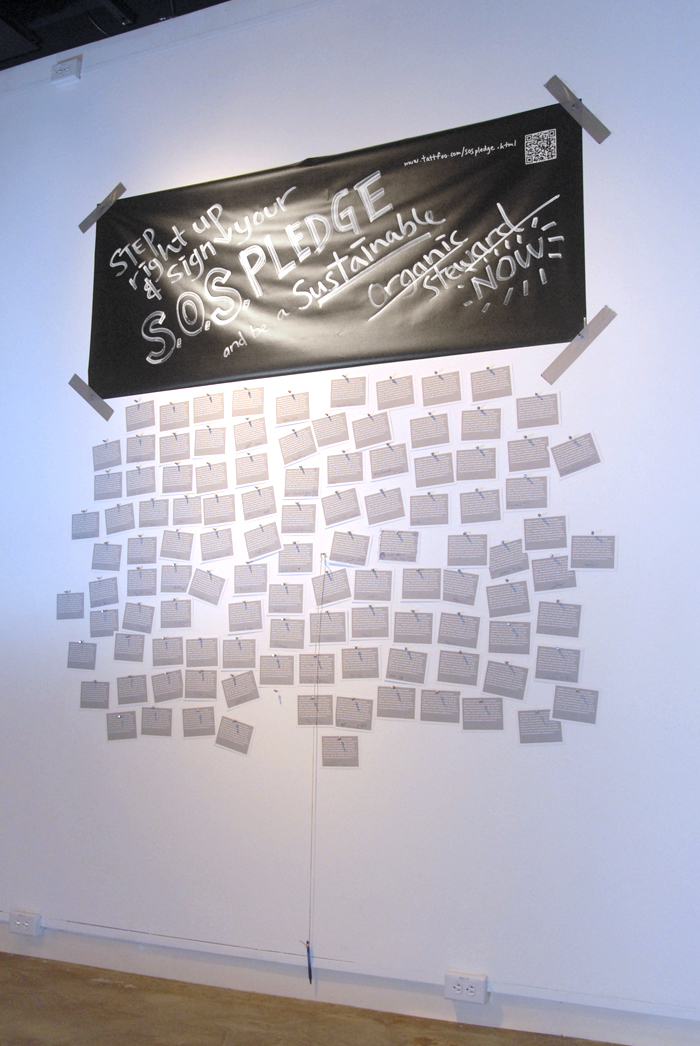 Awesome! The "S.O.S. Pledge" (Sustainable Organic Stewards) has become an interactive education piece in our garden and I continue to salute its creator, Mr. Tattfoo Tan. The message carries the vibration of a very creative artist whom I respect greatly and could think of no better salute than to put his pledge in our garden! Everyone gets it Tattfoo! - Chef Tarsha