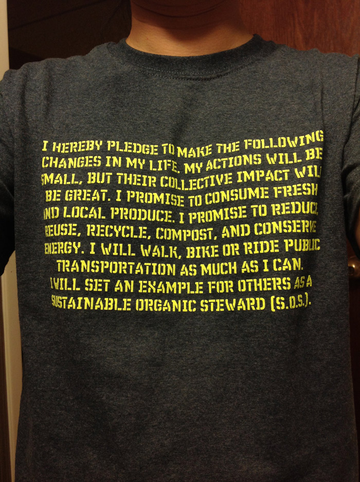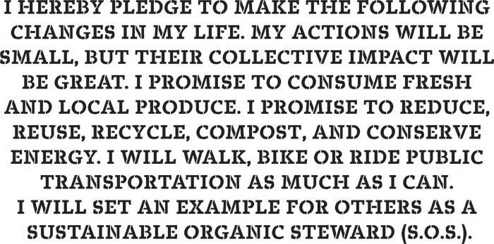 나는 신선한 지역 농산물을 소비할 것을 약속한다. 나는 낭비를 줄이고 재활용하고, 음식물 쓰레기를 퇴비로 만들고, 에너지를 절약할. 것을 약속한다. 내가 할 수 있는 만큼 걷고 자전거를 타고 대중 교통 수단을 이용할 것이다. 나는 지속 가능한 유기동 스튜워드 (SOS)로 타인에 대한 예제가 되겠다.