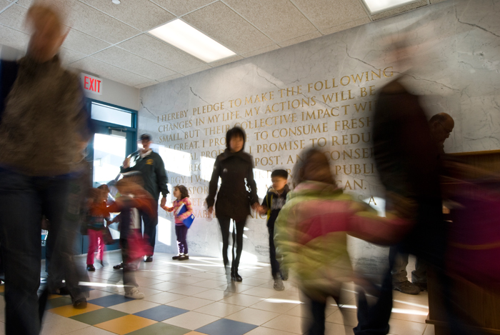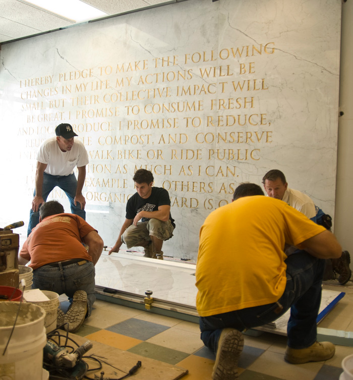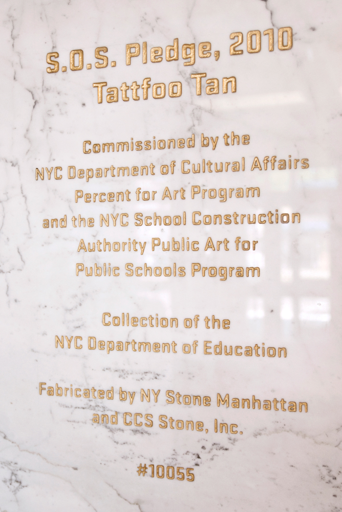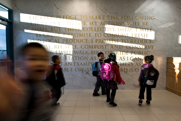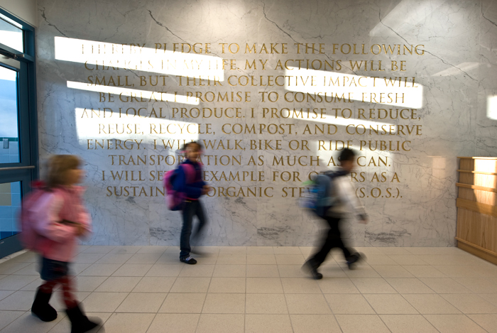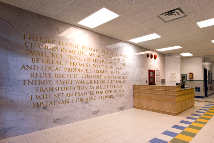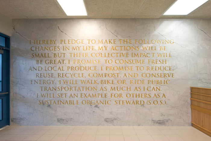 S.O.S. Pledge is an appropriation of The Pledge of Allegiance with a more green mission. This white Carrara Venatino Marble mural is 10 ft. high and 27 ft 9 in. wide. It is etched in with text that is painted gold. This artwork will engage and encourage young student to be a green steward when they attend school and walk by the lobby everyday. Understanding what we can do and change in our own live, even our action might be small, but our collective efforts and impact will be big. The school is a new 379-seat early childhood center which serves children in pre-K through second grade is also part of The Green Schools Alliance.